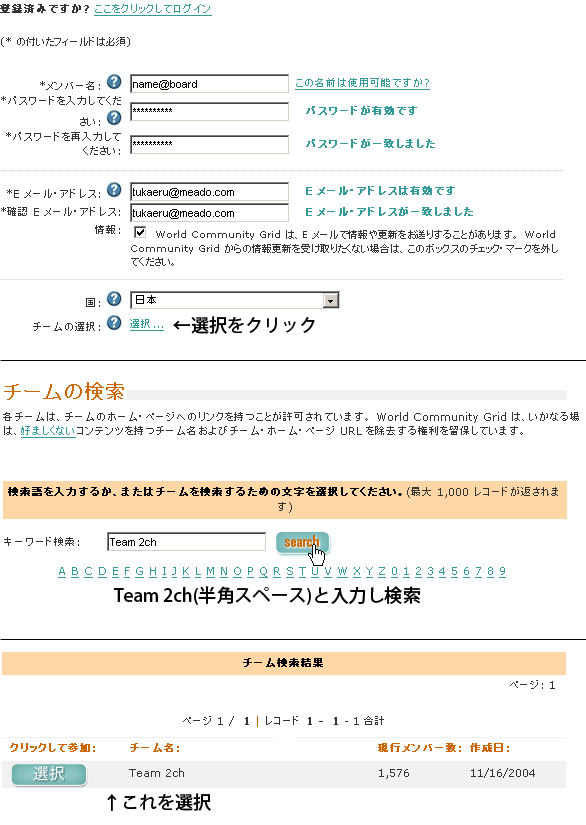 メールアドレスは他のBOINCプロジェクトに参加している場合は同じ物を入力します。またパスワードを忘れてしまった場合の受け取りにも使うので有効な物を入力します。フリーメールでも携帯のメールでもOK。